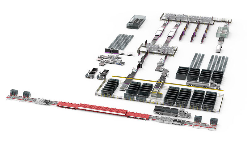 首先要了解的是,这套智能化玻璃深加工系统包括先进的硬件设备、完善的智能化联线系统以及打通销售、生产与售后服务之间的系统管理通道。硬件上从原片仓储系统到重型切割机,柔性砂带磨,清洗,存储分拣理片系统、激光打码系统,再到钢化,中空、夹胶等设备的智能化联线。