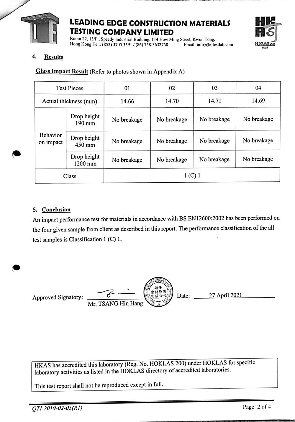 15mm白玻钢化撞击测试报告