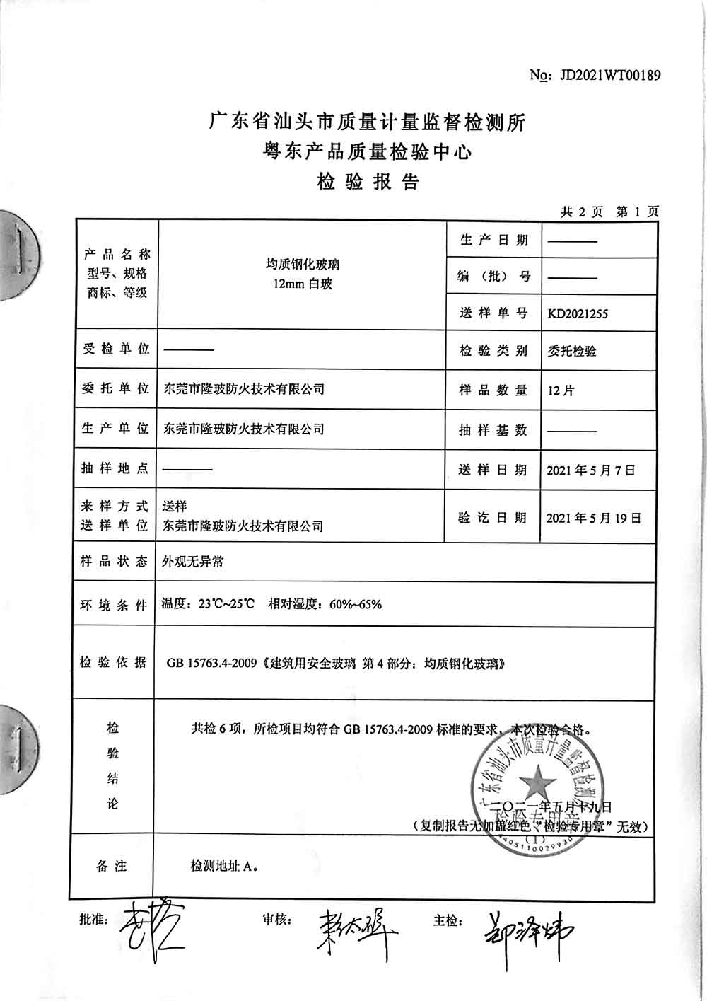 隆玻产品的各项技术指标均达到国家标准,通过国家检测认证机构检测认定,取得国家检验报告,所有产品均通过强制性产品认证。
