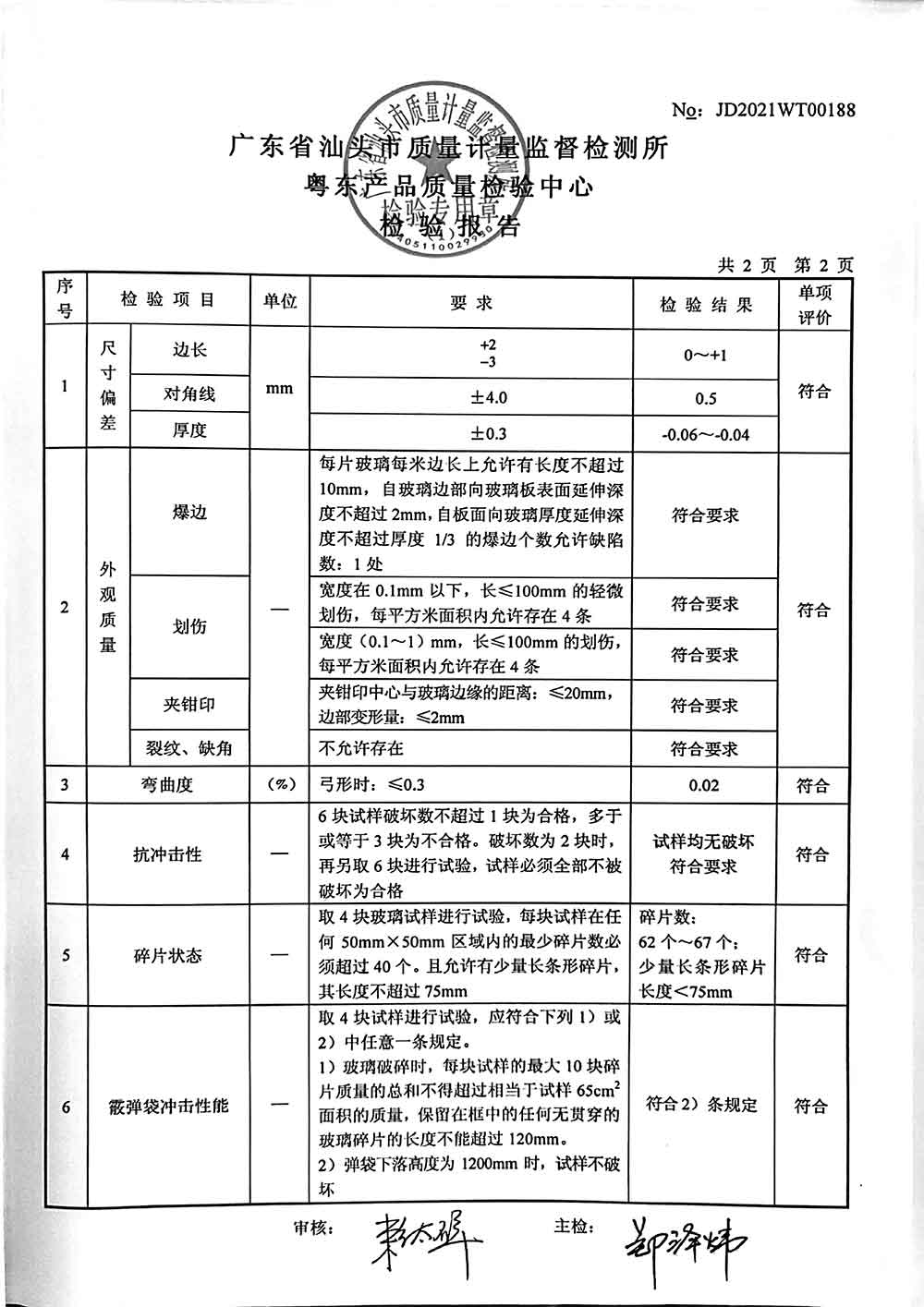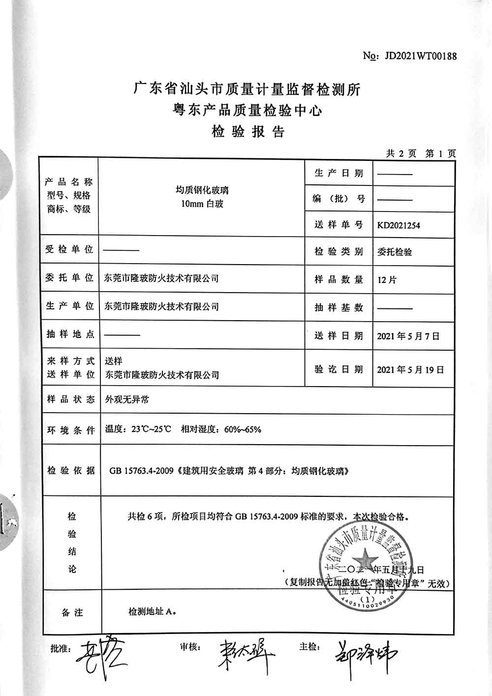 隆玻产品的各项技术指标均达到国家标准,通过国家检测认证机构检测认定,取得国家检验报告,所有产品均通过强制性产品认证。