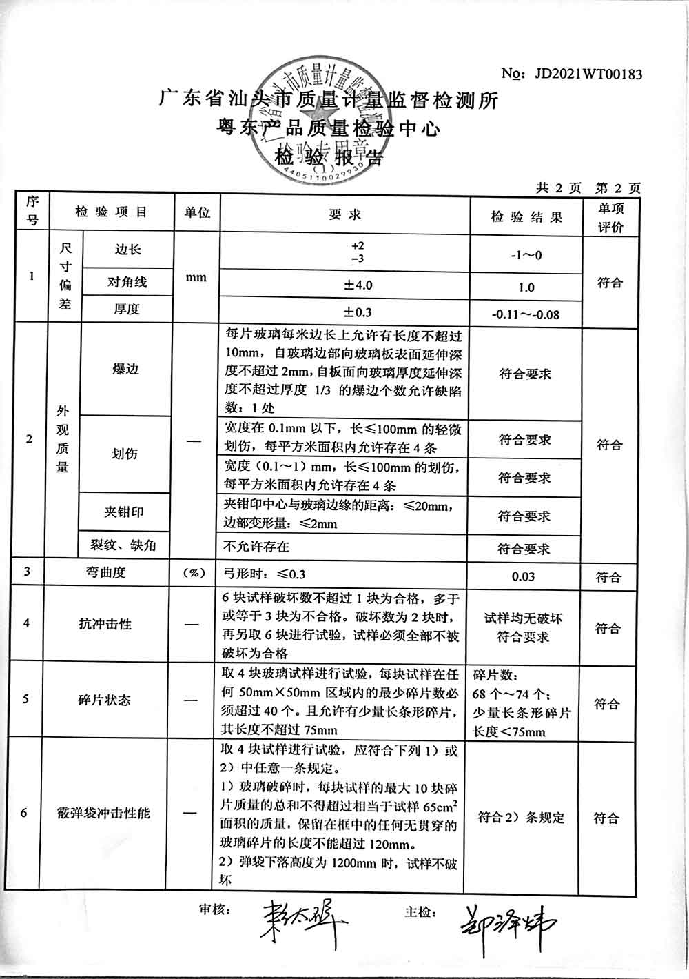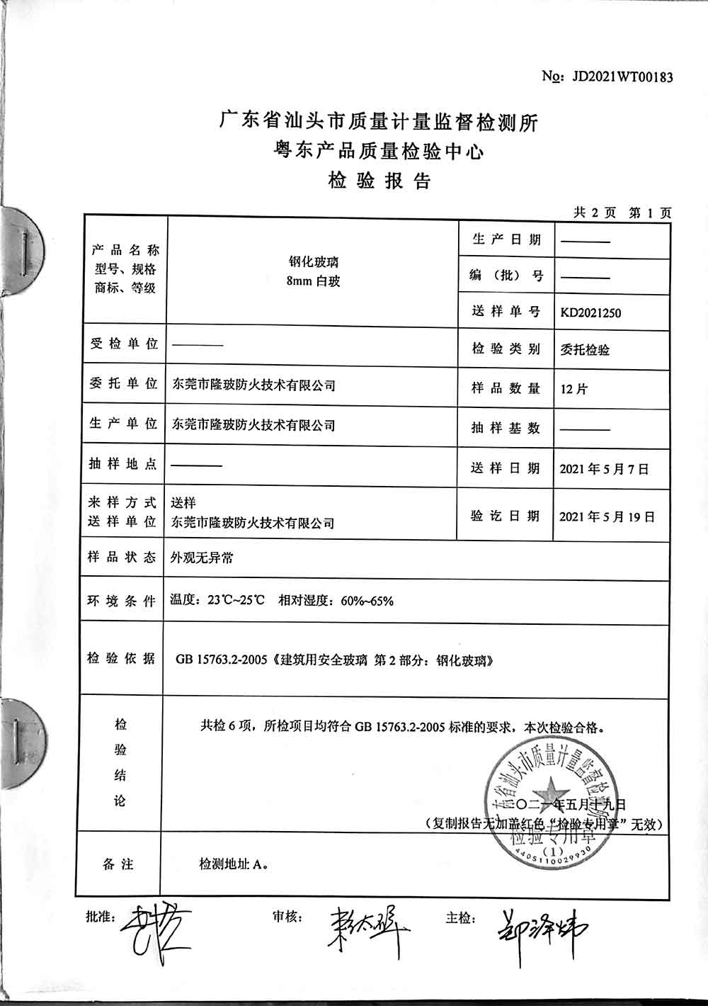 隆玻产品的各项技术指标均达到国家标准,通过国家检测认证机构检测认定,取得国家检验报告,所有产品均通过强制性产品认证。