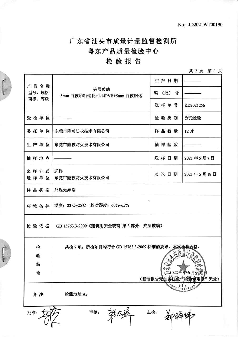 隆玻产品的各项技术指标均达到国家标准,通过国家检测认证机构检测认定,取得国家检验报告,所有产品均通过强制性产品认证。