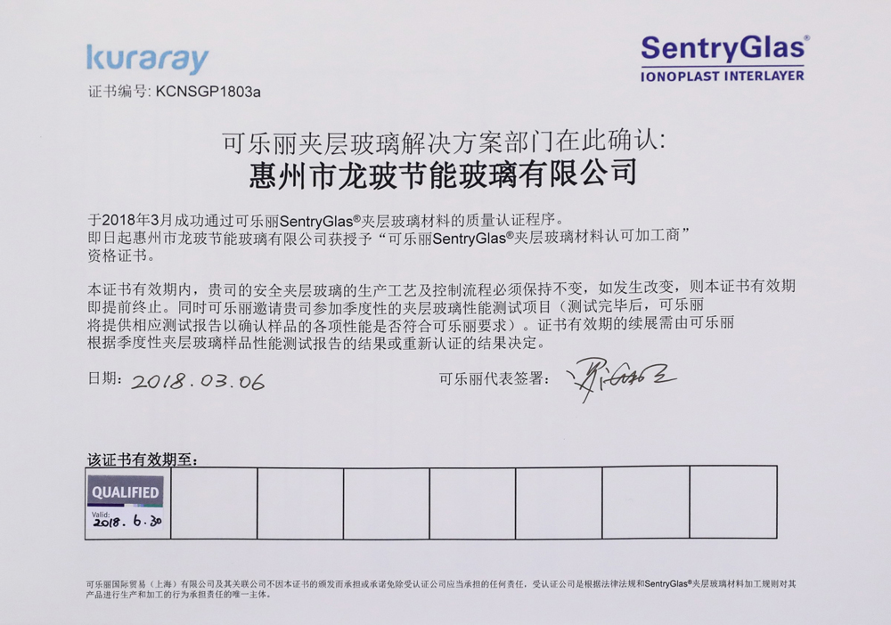 近日,广东隆玻科技集团旗下“惠州市隆玻节能玻璃有限公司”传来喜讯,公司于2018年3月成功通过可乐丽SentryGlas®夹层玻璃材料的质量认证程序,送样的测试结果全部满足可乐丽公司对于“合格SentryGlas®加工商”的送样样品性能检测要求,获得“可乐丽SentryGlas®夹层玻璃材料认可加工商”资格证书,并举行了证书授予仪式。这标志着广东隆玻科技集团正式成为国内为数不多的通过该认证、可采用SentryGlas®夹层玻璃材料生产高性能夹层玻璃的生产厂家,这是对广东隆玻科技集团20多年来深耕玻璃行业雄厚实力的又一力证。同时,这将进一步满足市场对安全玻璃需求的增长及对玻璃安全性、耐久性、美观性等方面的需求,大大拓展了夹层玻璃的性能,有利于促进整个安全玻璃行业发展。